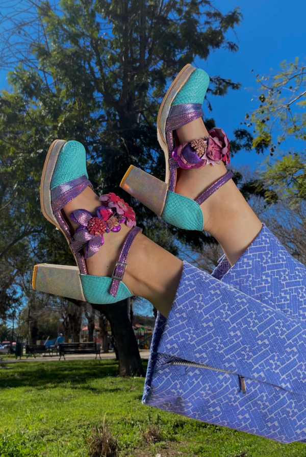 Diseño DEVI, Modelo reina de pulsera en empeine, tacón 9 cms, flores fijas de cuero y seda  *puedes personalizar la altura y colores*